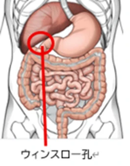 ウィンスロー孔(大網と小網によって形成される腹部の空間で、胃と肝臓の背側)